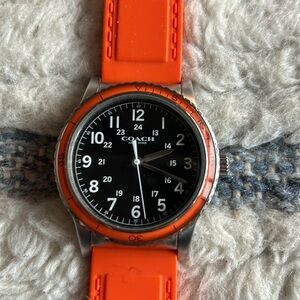 Coach sport watch. Orange rubber band. Great condition. Slight scuffs on back, as seen in pics. Needs a battery change