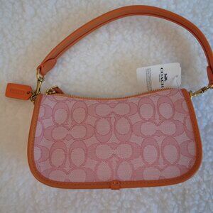 The Coach Swinger 20 bag has dimensions of 7.75 inches in length, 4.75 inches in height, and 2.5 inches in depth. It also features a detachable handle with a 6 3/4 inch drop. The bag has a zip-top closure and a fabric lining!