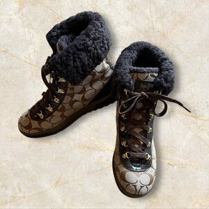 UPPER MADE WITH WATER AND STAIN RESISTANT 12CM SIGNATURE LOGO JACQUARD FABRIC IN BROWN AND TAN COLOR, CRINKLED PATENT LEATHER TRIM IN BROWN COLOR. ROUNDED TOES. CUSHIONED INSOLE. FULL SHEARLING LINING AND CUFF FOR WARMTH AND COMFORT. ADJUSTABLE LACE WITH METAL CHROME HOOK CLOSURE. 1" HEEL. COACH EMBOSSED THREADED NON -SKID RUBBER SOLE.