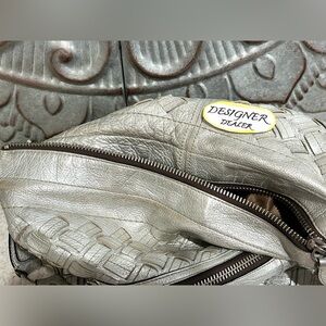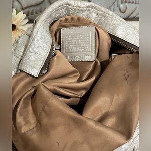 COACH THOMPSON Woven Metallic Juliette XL Bag # 11980. Silver tone hardware. Depending on how the light catches the bag it’s a silvery with a touch of gold. Fair to Good preowned condition, depending on your opinion. This bag has some wear. This has wear to the exterior metallic color, the pull strap has wear to the bottom part of the metallic color,as does the underside of the strap and the interior has marks and some pen marks Shown. We have not tried to get anything out. No tears rips or smells. Approx 16” across x 14”H x 2.5”D. Strap hangs at least 10”, depending on how far you push the center down. This bag weighs approximately 2.3 pounds. Colors may vary by each individual computer. This bag originally retail for $1100!