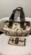 Chic shoulder bag with matching wallet. Features a stylish brown and cream design. Perfect for everyday use.