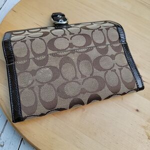 COACH TRI-FOLD Brown SIGNATURE C Monogram FABRIC LEATHER WALLET WITH BUCKLE