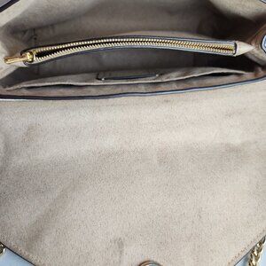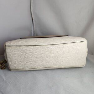 like new Coach shoulder bag with chain crossbody strap that can also be shortened for shoulder strap. Refined leather with inside zip and multi function pockets; magnetic closure. fabric lining. outside open pocket. 10 1/4" x 6 3/4" x 3 3/4". Small blemish on leather shoulder strap - see photo Neutral colors: tan and cream