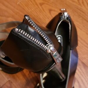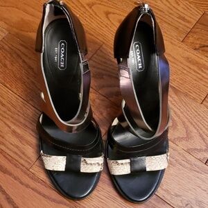 COACH Multi color leather and wood heels. Silver, black and tan color straps. Zipper in the back. Wear shows only on the bottom of the shoes. Open toe. Heel approximately 4.5" inches.Great condition. <#19.S23>