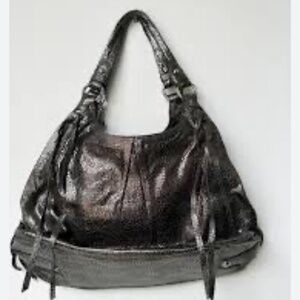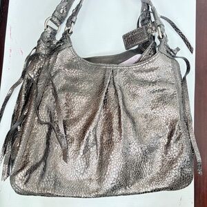 Metallic snakeskin-like print. Pewter / gray color. Silver hardware. Lilac silk interior. Tassels on side, many compartments . No. C0926-13898 introduced 2011