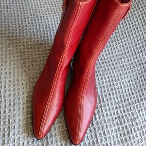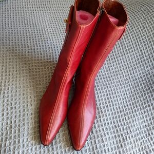 OMGOSH!!! You hit the COACH JACKPOT with these made in Italy, flawless 1990's vintage 1 1/2 kitten heel, pointed toe, burnt red leather, zip up the side, boots. The miniature side pockets open and close with the classic COACH toggle and the rubber soles keep you from slipping. These are truly an UNBELIEVABLE FIND. I even have another pair in brown. Height 10". Serial Number P388 MONIQUE G3