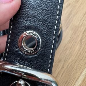 The COACH Vintage 1415 Soho Cross Body Shoulder Bag is a stylish and versatile accessory for women. Made of black leather with silver hardware accents and stitching details, this medium-sized rectangular bag features a zip closure and a black leather adjustable shoulder strap for easy carrying. Ideal for travel, casual outings, workwear, and business occasions, this crossbody/shoulder bag also includes inner pockets, a mobile phone pocket, and a lined interior for organization. With a vintage vibe and a minimalist design, this bag is perfect for those who appreciate classic style with a modern twist.