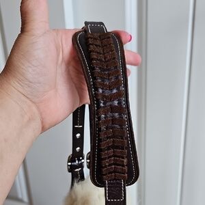 Vintage Coach shoulder bag with signature pattern, faux fur. Features a tan jacquard and brown suede design. Accented with luxurious fur trim.