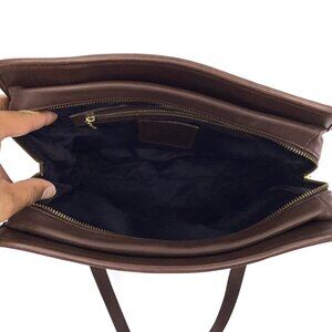 This Coach vintage 90s Brown Mocha Shoulder/Tote Bag crafted from thick gloved-tanned leather has a chocolate brown silk/satin lining and gold tone hardware/accents. Other features include double shoulder straps, a full zip top closure with leather pull, 1 Coach leather hangtag, 2 large interior slip pockets with magnetic snap Closure and 1 main full zippered interior compartment.