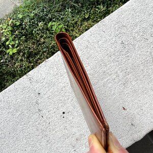 In the booklet, "The Story of Coach Water Buffalo Hide," (not included) Coach gushed that they had never seen in their 40 years of making wallets a leather that was so thin, yet firm and with the beautiful grain of a fine piece of wood." Coach also details the process to get the leather so smooth and soft along with distinct colors. Amazing! It's a wallet with plenty of character, which fits flatly in your pocket and carries the basics (no coin pouch).
