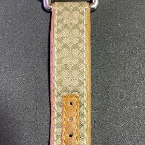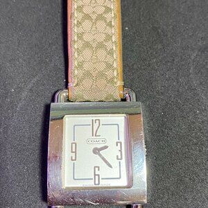 COACH WATCH LADIES WHITE SQUARE DIAL: MODEL 0221. Silver tone bezel. Water resistant 5 ATM. Genuine Coach leather band. Swiss made. New battery. Band has buckle closure and fits up to 7 1/4 inch wrist.