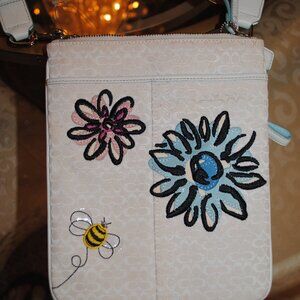 COACH WHITE BUMBLE BEE CROSS BODY BAG. 2 EMBROIDERED AND SUEDE LEATHER FLOWERS ON FRONT AND STICHED AND LEATHER BEE. 8 1/2IN X 7IN, 25 IN ADJUSTABLE NYLON SHOLDER STRAP. WHITE NYLON FABRIC W/ CLASSIC COACH "C" DESIGN FRONT AND BACK. 5IN ZIPPERED POCKET ON BACK, 7IN POCKET ON FRONT, 7IN ZIPPER ON TOP TO KEEP BAG CLOSED. BLUE NYLON LINED. REAL CUTE BAG.