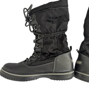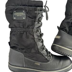 These Coach Shaine boots in black are designed to keep you warm and dry with their insulated mid-calf height and durable rubber sole. The lace-up style and side zipper ensure a secure fit, while the weather-resistant materials make them perfect for cold and wet conditions.