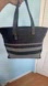 Exterior is black and gray wool, with black leather trim and handles. Bag tag black leather.