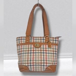 Purse by Coach in excellent used condition. Gorgeous wool plaid design and tan leather. Front and back pocket. Gold hardware accents. Clean inside and outside. No mayor signs of wear. Fits all your essentials like phone, make up pouch, IPad & more.