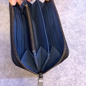 Beautiful Men’s zip around Coach wallet in signature logo print and blue stripe. Accordion style, zippered pouch inside, with three spaces for bills, room for 12 cards. “Coach New York” engraved on zipper pull.