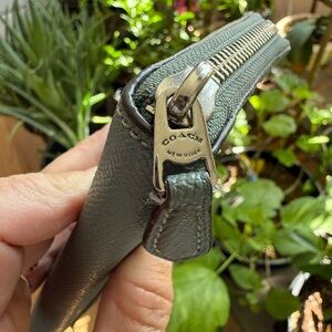 This is a Coach women's accordion zip wallet in gray crossgrain leather with a green interior. It features a zipper closure, Coach logo accents, credit card slots, and a folding design. The wallet is medium-sized, measuring 7.5 inches in length and 4 inches in width, making it a stylish and functional accessory for women.