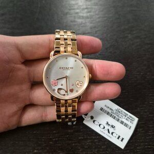 A modern classic with a playful twist. This Coach Elliot watch features a polished rose gold-tone stainless steel bracelet paired with a sleek white sunray dial. Scattered Coach charms—including the signature “C,” a heart, and a floral motif—add a unique, feminine touch to this minimalist design.