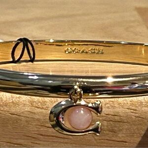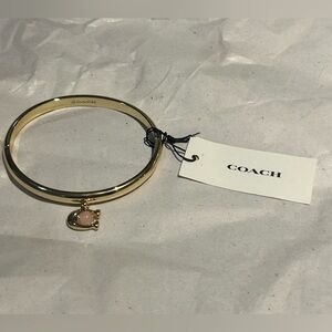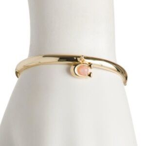 Elegant Coach bangle in gold with a charming pink accent. Perfect for adding a touch of sophistication to any outfit. Clasp closure. Coach logo bangle either peach stone. Dainty and delicate. Looks stunning when worn. Designed and made by COACH. Brand new with tags.