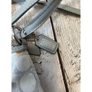 • It has silver-toned hardware and a gray leather crossbody strap.