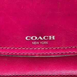 Stylish COACH pink leather wallet with 6 credit card slots and 2 separate pockets for bills. snap closure, and outside zipper for coins. Perfect for daily use. Sleek and functional design.