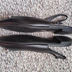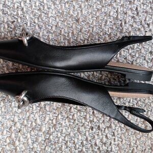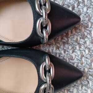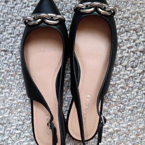 COACH Womens Point Toe Slingback Flats in Black. Silver chain hardware on the toe with Coach insignia. Comfortable and Classic. Leather Upper with a treaded Coach insignia sole. Leather (or faux) footbed - sewn in for sturdiness and wear & tear. Size 9. Comes with box.