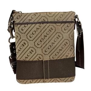 Coach Word Signature Stripe Brown Crossbody Bag. Two outside pockets. Zip close. Lining on pockets and interior very clean. Adjustable Strap – maximum strap drop 23.5".