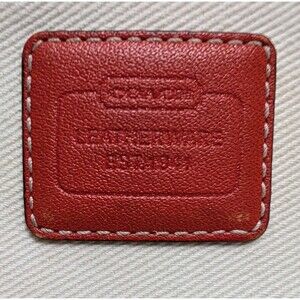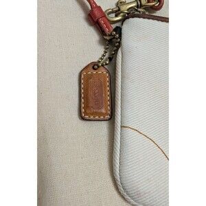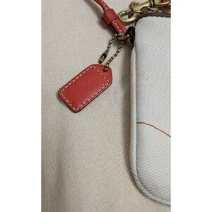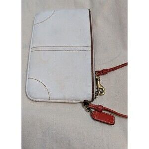 The COACH Wristlet Coin Purse in white color coated fabric with tan leather strap/trim is a stylish and versatile accessory for women. This small wristlet features a zip closure, orange handle/strap, brown hardware accents, and a vintage logo/signature design. The exterior is made of polyester and cotton with a brown leather trim and strap, perfect for adding a touch of luxury to any outfit. The purse also includes a coin purse accessory, making it both functional and fashionable. The 6-inch strap drop and compact size make it easy to carry on the go, making it a must-have for any fashion-forward individual. **Slight discoloration, can be removed with washing***