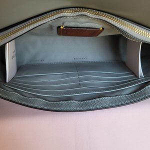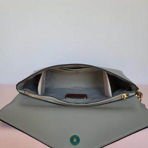 BRAND NEW WITH TAGS. Dove Grey color. A structured large leather clutch with detachable wrist strap in an elegant envelope design with snap closure. Features an interior zip pocket, slip pocket, credit cards slots plus an exterior zip pocket for easy organization. Crafted of scratch-resistant crossgrain leather with a front “C” logo.