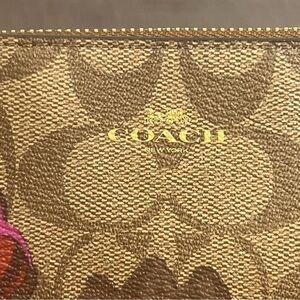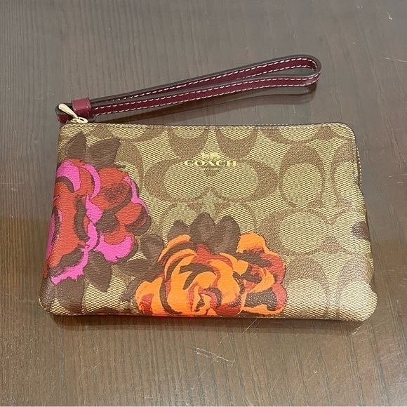 Coach corner zip wristlet with a floral print. The wristlet is brown and has a large floral design on the front. The flowers are in different colors, including pink, yellow, blue, and green.
