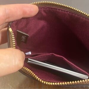It is made of Signature monogrammed canvas and smooth leather, and it has a spacious interior with two credit card slots, a zip-top closure, and a fabric lining. It is the perfect size for carrying all of your essentials on the go.