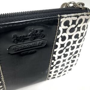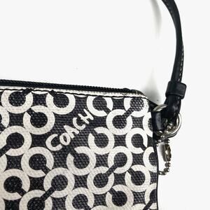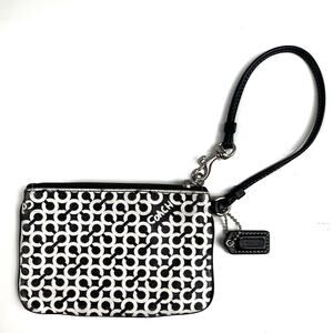 Y2K Coach wristlet, black white CC monogram, patent leather trim, mini clutch purse, early 2000s Coach bag, silver hardware microbag, Coach Poppy style wristlet, vintage Coach accessories, canvas logo bag, detachable strap clutch, black fabric lining, compact designer wristlet, Carrie Bradshaw Y2K fashion, minimalist Coach wristlet, slow fashion vintage bag, authentic Coach purse, reworked Y2K revival accessory