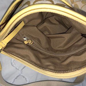 CUTEST SUMMER PURSE. COACH FABRIC WITH CANVAS LIKE ADJUSTABLE STRAPS. PURCHASED NEW AT COACH STORE , MY DAUGHTER USED IT ONCE. ZIP TOP CLOSURE. OPEN POUCH ON SIDE. INSIDE LOOKS BRAND NEW- ZIP CLOSURE POCKET.