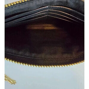 * The exterior features premium pebbled leather, gold tone logo hardware, a wristlet strap, and a back slip pocket