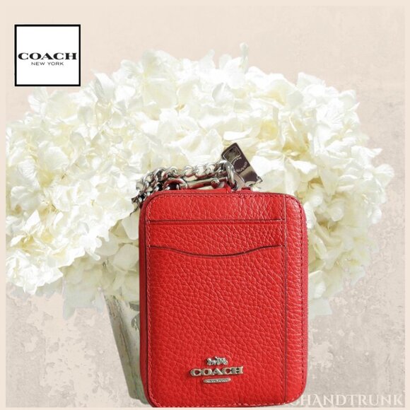 COACH Zip Card Case Cherry Leather Gunmetal Accents Detachable Chain