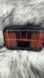 This bag is smooth calf leather in a printed plaid canvas. and it has two credit card slots. Slight wear in one of the corners.