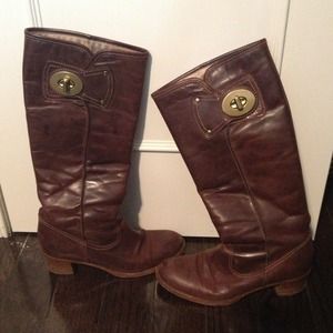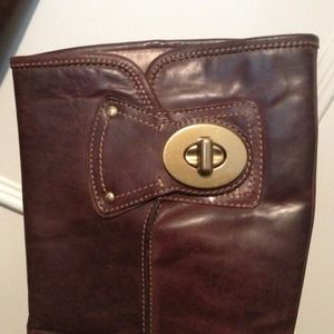 Classic coach boots in color called whiskey (reddish brown). Heel height is 2" and the opening at top is 14.5" in circumference