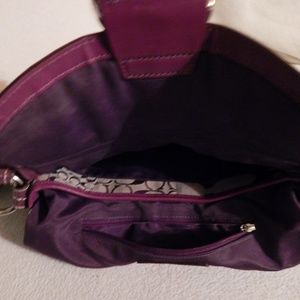 COACH great preowned condition. Has some slight staining at the bottom corners that is not very noticeable and small stains on inside material at the bottom of bag .The leather trim is in great condition as well as the strap. Contact us with any questions.