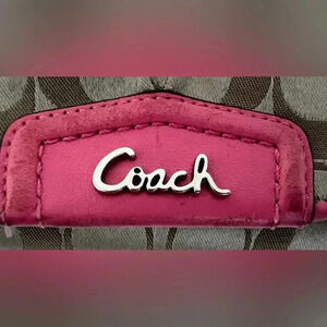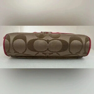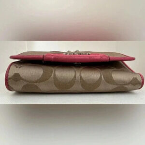 Womens Signature Jacquard pink and khaki clutch style wallet. Flap over snap closure. The back has a slide in pocket. The interior has 2- slide in pockets. 8- card slots. 1- ID slot. 1- zippered coin purse with two slots. Traditional C Coach logo canvas with hot pink leather trim. On the front is a silver metal Coach logo. This wallet is in used condition, there are some flaws, see pictures. The canvas is lightly snagged (see pictures).