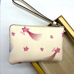 This is a brand new in original box, Coach Boxed Corner Zip Wristlet with Disco Star Print. It features two cute charms. One charm is a signature C and the other is a pair of Martin glasses. This is Coach Style No. C7350.