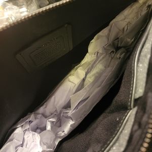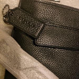 NWT Coach pebbled leather zip pouch, clutch, has external hand strap to slip in hand and leather pull strap with coach tag.