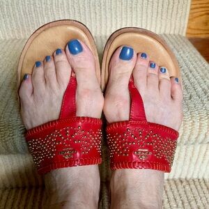 Red leather thong sandals with small gold stud details. “Whipstitch” detail trim. Leather soles… cushioned leather footbed. Worn only a few times. Very comfortable!