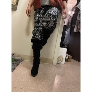 Italian leather nubuck suede/black w/black rabbit fur cuff/trim & double belted decorative buckle closure & size zippers