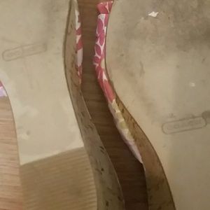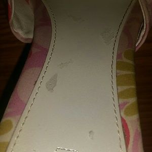 Floral print, corked heel, Coach wedges. On picture 5 it shows that the insole has a scrape.