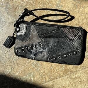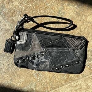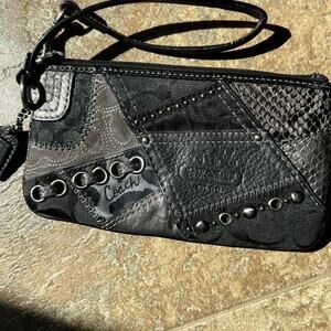 COACH wristlet. Black and gray, with a bit of shimmer. Has zipper on top. Includes small COACH tag on a chain. The wristlet has “patches “ and metal studs. Eyelets that have woven strapping. *see photo-has a crack and some deterioration in bend of strap. Other than that-great condition! Approximately 7” x 4”.
