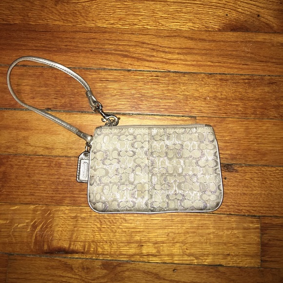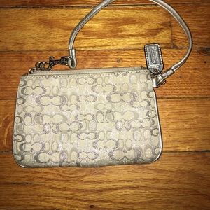 Genuine COACH Wristlet, has a few stains and is a bit dirty, but really cute. Would be like New if cleaned because it's in good condition otherwise. Silver with varying colors of silver/ grey Cs. Lavender interior. Perfect for a night out! No trades but offers welcome. Smoke and pet free home.