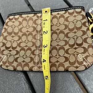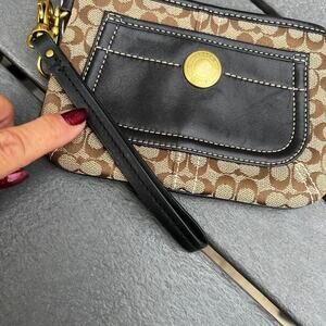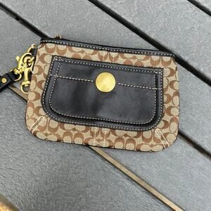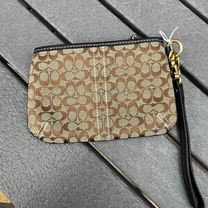 Coach wristlet small bag. Approximately 7 x 4 1/2”. Has Coach tag, wristlet strap, small pocket on the outside and a zip closure on top.*small wear mark on wristlet strap.