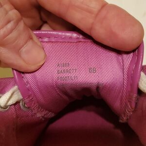 Green, orange, green, pink and blue striped fabric and pink leather trim. Great condition.