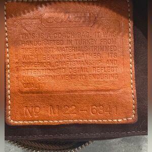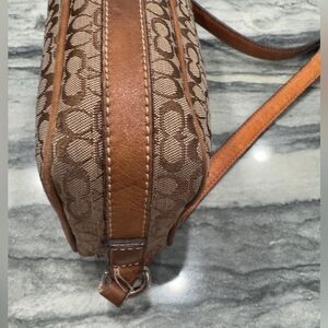 Stylish vintage Coach crossbody bag. Features signature pattern. Compact and versatile design.