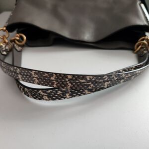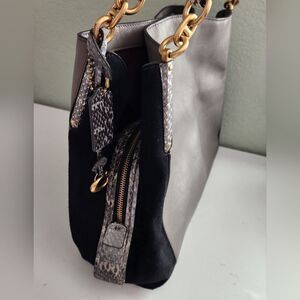 Stylish gray and black women's bag with elegant colorblock design and snakeprint accent . Perfect for any occasion.